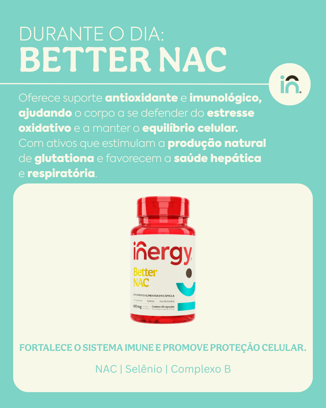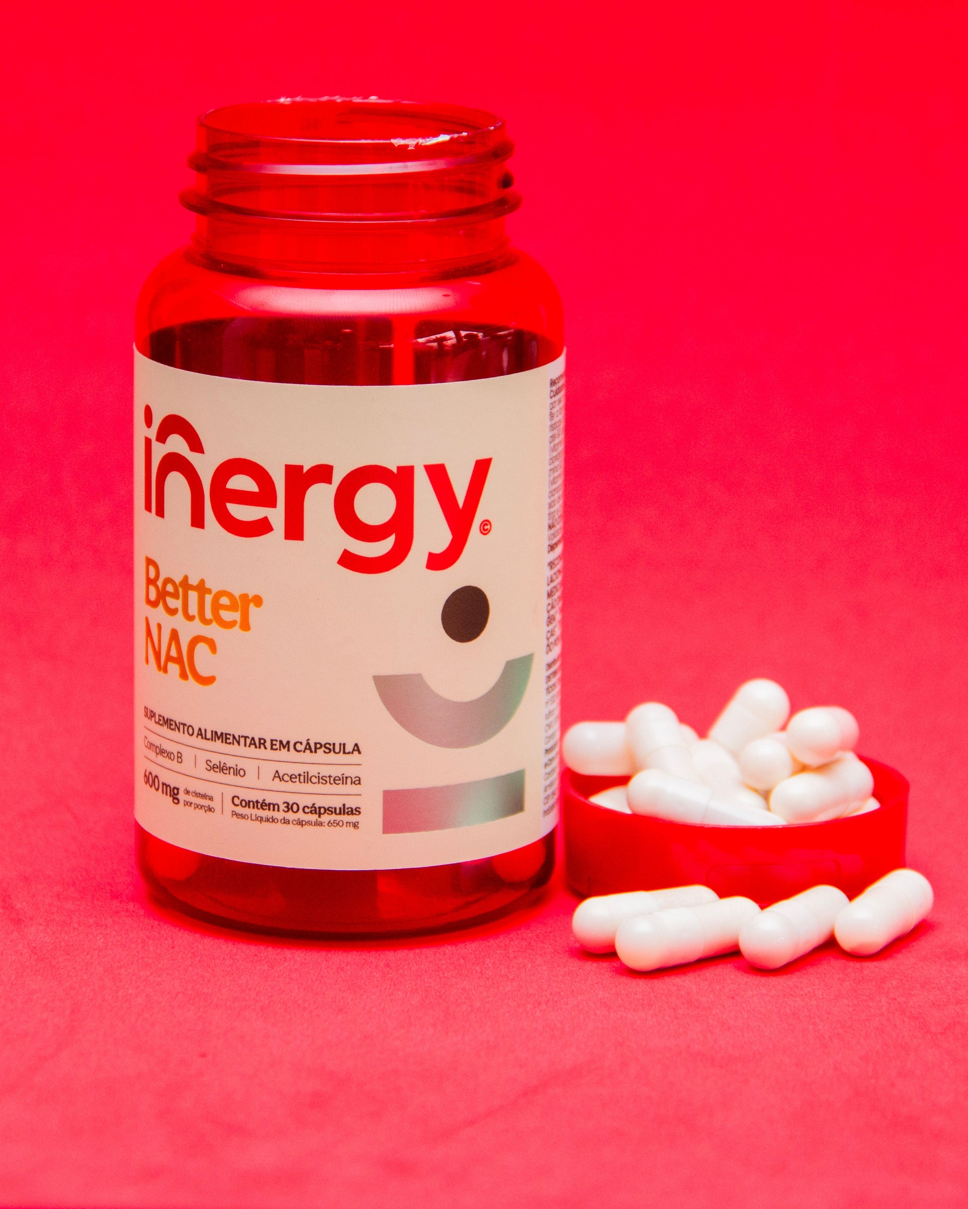 Adicione o poder antioxidante e protetor do NAC à sua rotina diária com o Better NAC Innergy®. O produto conta com 600mg de Císteina, um aminoácido essencial na redução dos danos oxidativos e na melhora da saúde respiratória. Com apenas 1 cápsula por dia, sinta sua recuperação dos treinos aumentar, sua imunidade se fortalecer e você ser capaz de alcançar seus objetivos mais altos.